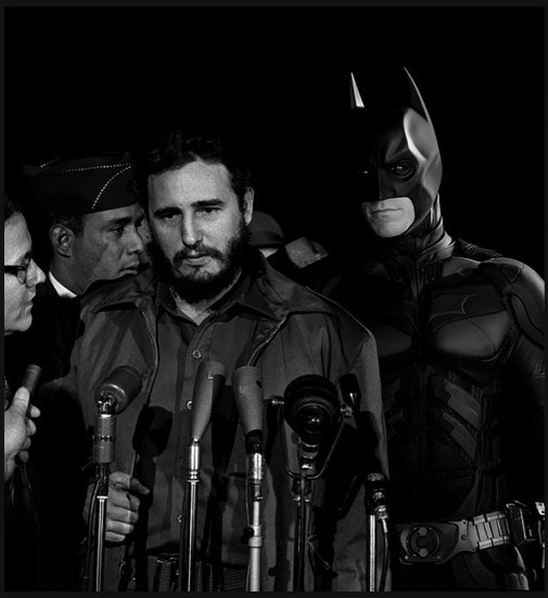 訪米し記者会見へ臨むカストロ議長にささやく・・・バットマン?
